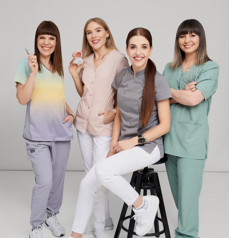 Kiekvienas mūsų komandos narys ne tik atlieka savo darbą, bet ir kuria pasitikėjimu grįstą ryšį su pacientu – aiškiai paaiškina situaciją, parenka tinkamiausią gydymo sprendimą ir pasirūpina, kad visas procesas būtų kuo komfortiškesnis. Tikime, kad geriausi rezultatai pasiekiami dirbant kartu, todėl bendradarbiaujame kaip komanda, siekdami vieno tikslo – sveikos, gražios ir ilgalaikės jūsų šypsenos.